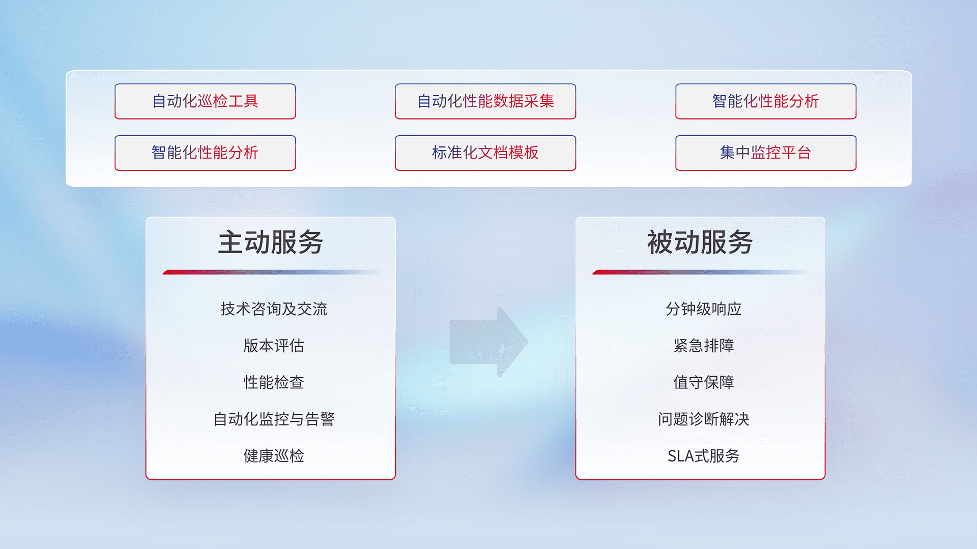 智能化工具和标准化文档,,保障服务质量,,提供主动服务(包含技术咨询、、、版本评估、、、、性能检查、、、自动化监控与告警、、、健康巡检)和被动服务包含(分钟级响应、、、紧急排障、、、值守保障、、问题诊断解决、、、、SLA服务)。。。。
